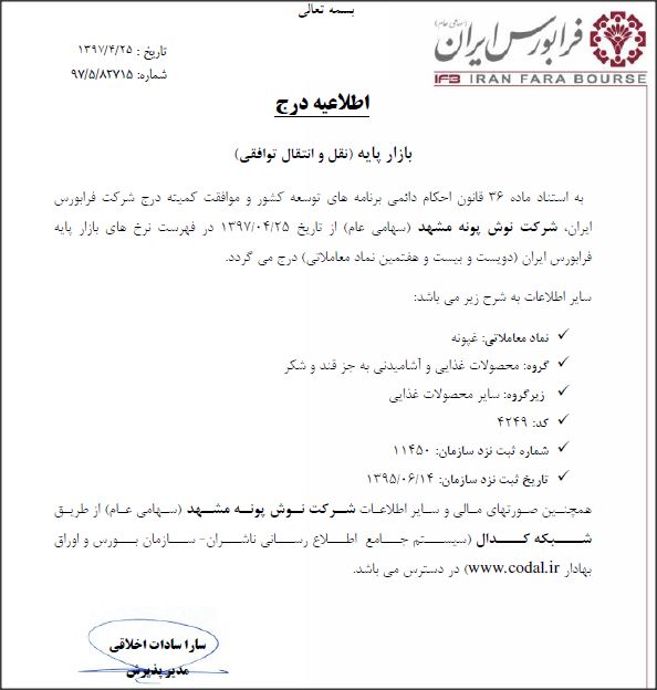 به گزارش ایبِنا، شرکت نوش بونه مشهد(سهامی عام) به استناد ماده ۳۶ قانون احکام دائمی برنامههای توسعه کشور و موافقت کمیته درج شرکت فرابورس به عنوان دویست و بیست و هفتمین نماد معاملاتی در فهرست نرخهای بازار پایه فرابورس درج شد.