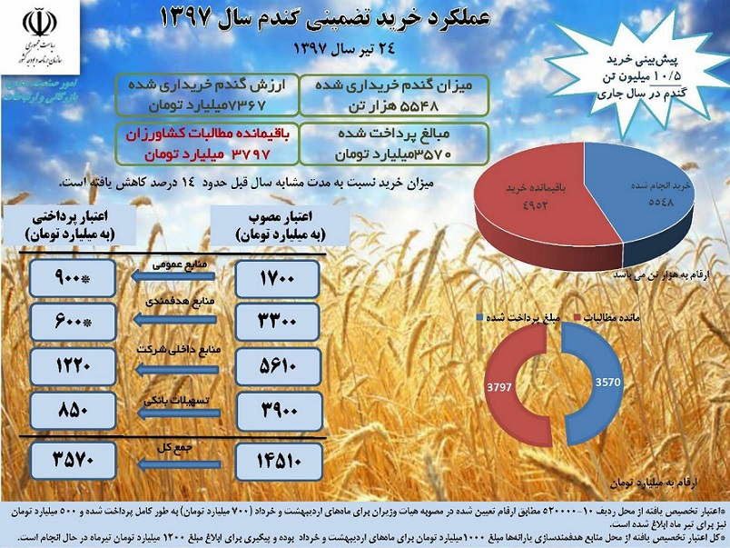 به گزارش ایبِنا، بررسی آمار عملکرد خرید تضمینی گندم در سال ۹۷، نشان میدهد، تا ۲۴ تیرماه ۵ میلیون ۵۴۸ هزار تن گندم از کشاورزان خریداری شده است. طبق پیش بینی وزارت جهاد کشاورزی، خرید ۱۰.۵ میلیون تن گندم برای سال جاری در دستور کار قرار دارد. در حال حاضر ارزش گندم خریداری شده ۷ هزار ۳۶۷ میلیارد تومان بوده که تا این مدت بالغ بر ۳ هزار ۵۷۰ میلیارد تومان پرداخت شده و ۳ هزار و ۷۹۷ میلیارد تومان باقی مانده مطالبه کشاورزان است.