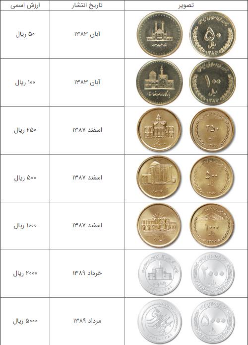 در حال حاضر، سکههای ۵۰ ریالی، ۱۰۰ ریالی، ۲۵۰ ریالی، ۵۰۰ ریالی، ۱۰۰۰ ریالی، ۲۰۰۰ ریالی و ۵۰۰۰ ریالی مسکوک رایج رسمی کشور محسوب میشوند.