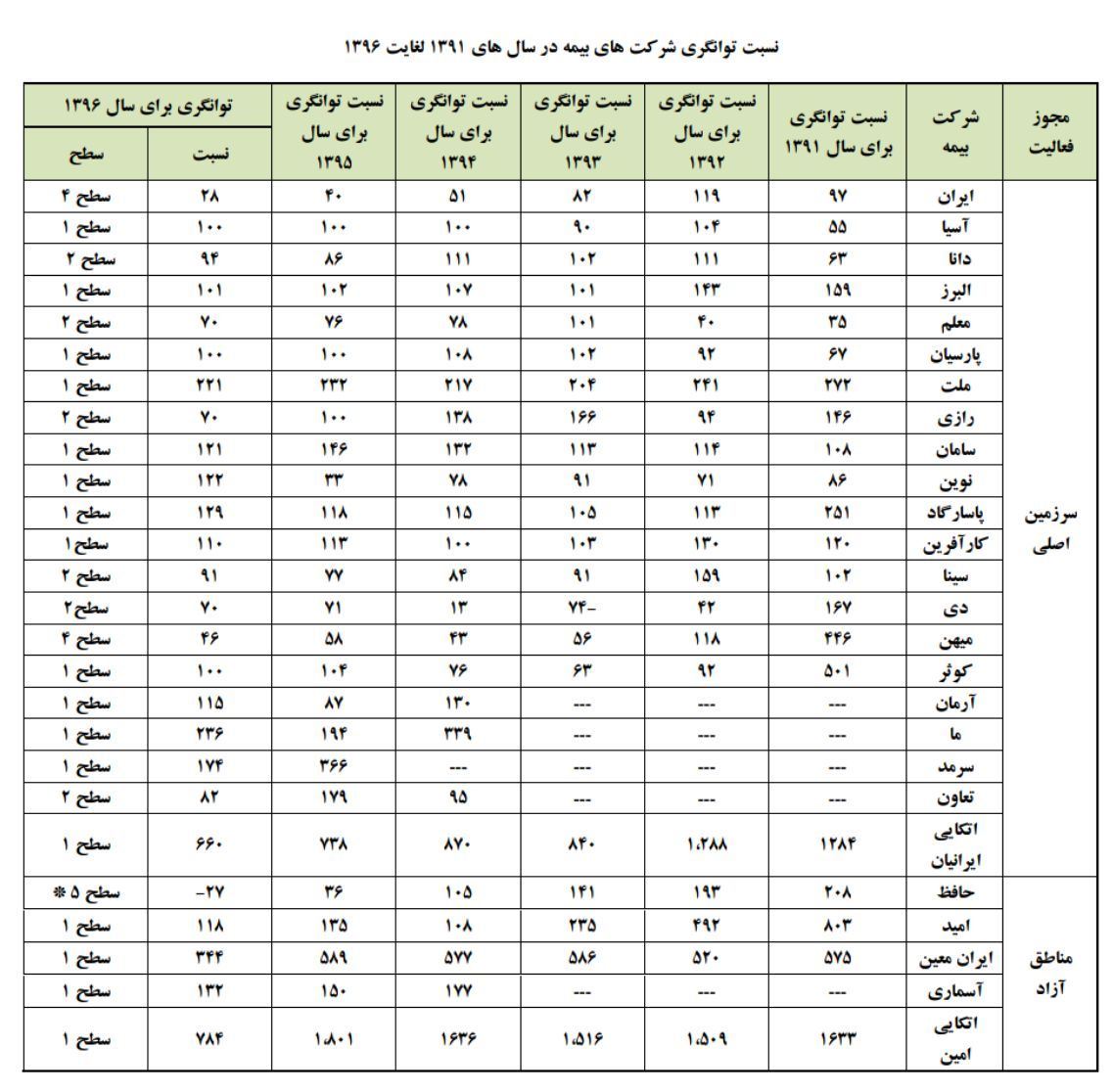 براساس جدول خلاصه وضعیت توانگری مالی شرکت های بیمه از سال ۱۳۹۱ تا ۱۳۹۶، شرکت های بیمه آسیا، البرز، پارسیان، ملت، سامان، نوین، پاسارگاد، کارآفرین، کوثر، آرمان، ما، سرمد، امید، ایران معین، آسماری، اتکایی ایرانیان و اتکایی امین در سطح توانگری یک اعلام شده اند.