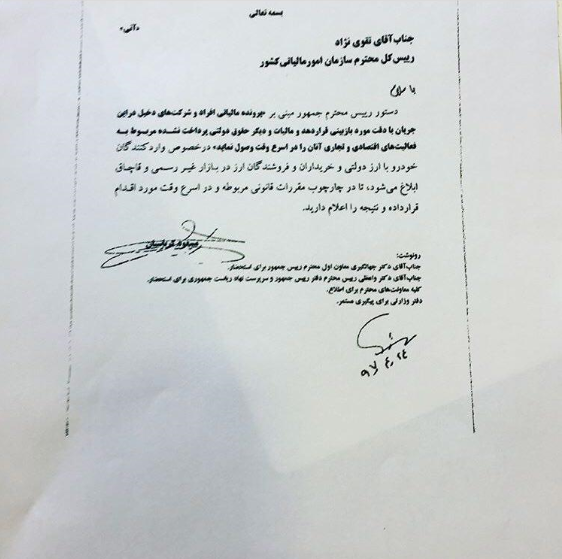 همچنین درابلاغیه ای جداگانه به سیدکامل تقوی نژاد، رییس سازمان امور مالیاتی کشور درباره این پرونده، گفت: دستور رییس جمهوری مبنی بر "پرونده مالیاتی افراد و شرکت های دخیل در این جریان با دقت مورد بازبینی قرار دهد و مالیات و دیگر حقوق دولتی پرداخت نشده مربوط به فعالیت های اقتصادی و تجاری آنان را در اسرع وقت وصول نمایید" در خصوص وارد کنندگان خودرو با ارز دولتی و خریداران و فروشندگان ارز در بازار غیر رسمی و قاچاق ابلاغ می شود، تا در چارچوب مقررات قانونی مربوطه و در اسرع وقت مورد اقدام قرار داده و نتیجه را اعلام کنید.
