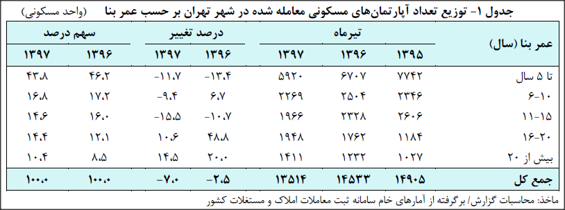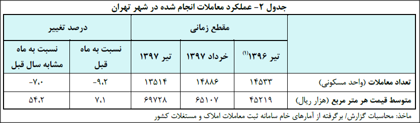گفتنی است گزارش تحولات بازار مسکن شهر تهران در تیرماه سال ۱۳۹۷ که برگرفته از آمارهای خام سامانه ثبت معاملات املاک و مستغلات کشور است، توسط اداره بررسی ها و سیاست های اقتصادی بانک مرکزی تهیه و منتشر شده است.