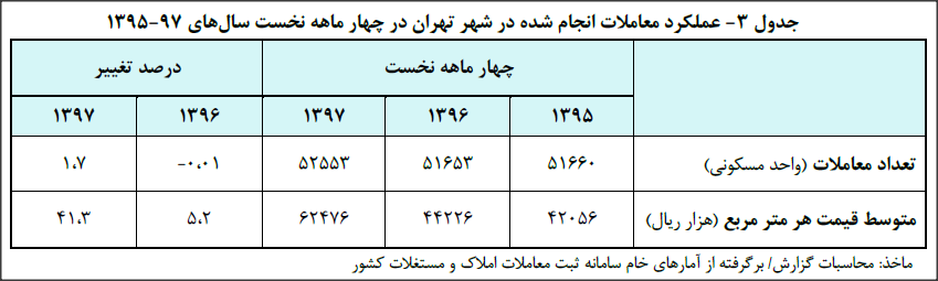این گزارش می افزاید: در چهار ماهه نخست سال ۱۳۹۷، تعداد معاملات آپارتمانهای مسکونی شهر تهران به ۵۲.۶هزار واحد مسکونی بالغ شد که در مقایسه با مدت مشابه سال پیش از آن، ۱.۷ درصد افزایش نشان میدهد.