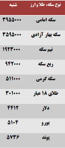 از سویی دیگر، امروز در بازار آزاد هر قطعه نیم سکه بهار آزادی با ۳ هزار تومان رشد یک میلیون و ۹۲۳ هزار تومان و هر قطعه ربع بهار آزادی نیز با ۸ هزار تومان کاهش به ارزش ۹۴۲ هزار تومان معامله شد. بر اساس این گزارش، هر قطعه سکه گرمی با یک هزار تومان افزایش نسبت به پنجشنبه گذشته ۵۱۱ هزار تومان معامله شد و هر گرم طلای ۱۸ عیار نیز با یک هزار و ۶۰۰ تومان رشد به ارزش ۳۰۱ هزار تومان فروخته شد.