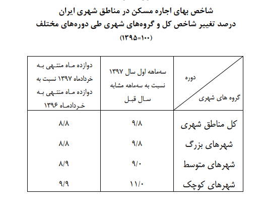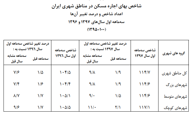 شاخص بهای اجاره مسکن در شهرهای بزرگ شامل اراک، اردبیل، ارومیه، اسلامشهر، اصفهان، اهواز، بندرعباس، تبریز، تهران، خرم آباد، رشت، زاهدان، زنجان، ساری، سنندج، شیراز، قزوین، قم، کرج، کرمان، کرمانشاه، گرگان، مشهد، همدان و یزد در سه ماهه اول سال ۱۳۹۷ به عدد ۱۱۴.۶ رسید که نسبت به سه ماهه قبل ۱.۹ درصد و نسبت به سه ماهه مشابه سال قبل ۹.۸ درصد افزایش نشان میدهد. شـاخص مذکور در دوازده ماه منتهی به خردادماه ۱۳۹۷ نسبت به دوازده ماه منتهی به خردادماه ۱۳۹۶ معادل ۸.۸ درصد افزایش داشته است.