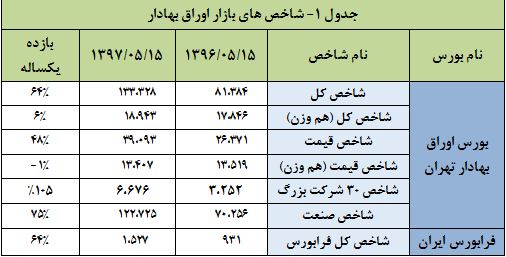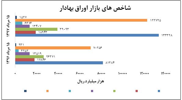 افزون بر این، آمارها مشخص می کند ارزش معاملات چهار بورس فعال بازار سرمایه (بورس اوراق، فرابورس، بورس کالا و بورس انرژی) با بازدهی ۷۹ درصدی همراه بوده است. محاسبه جزییات این مولفه نشان می دهد بیشترین رشد ارزش معاملات در این بازارها مربوط به بازارهای کالایی است و ارزش معاملات بورس های کالایی (کالا و انرژی) طی این دوره، ۱۳۸ درصد رشد نشان می دهد و از سویی دیگر، ارزش بازار اوراق بهادار که تجمیع بورس تهران و فرابورس است در مدت یکسال با رشد ۳۳ درصدی همراه بوده است.