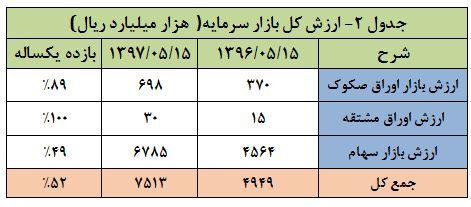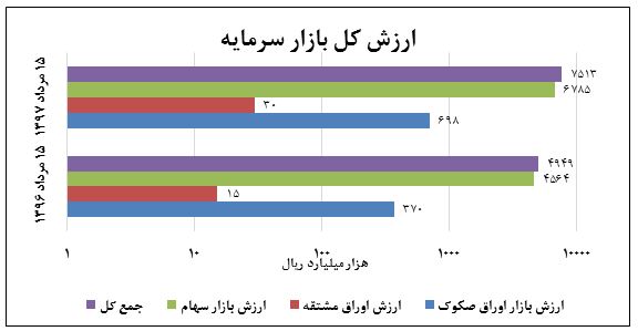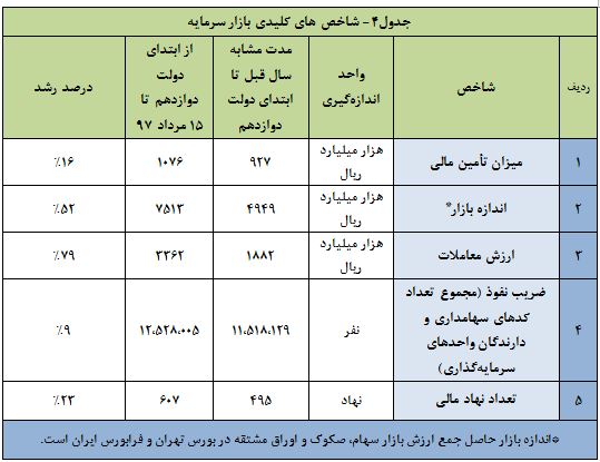 از سویی دیگر، ارزش کل بازار اوراق بهادر مولفه ای است که نشان دهنده اندازه بازار است. بر اساس این گزارش، طی یکسال فعالیت دولت دوازدهم رشد ۵۲ درصدی ارزش بازار به ثبت رسیده و ارزش کل بازار اوراق بهادار ایران از رقم ۴ هزار و ۹۴۹ میلیارد ریال در نیمه مرداد ۹۶، به ۷ هزار و ۵۱۳ میلیارد ریال در مدت مشابه سال ۹۷ رسیده است.