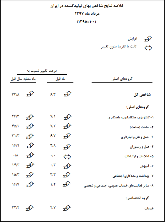 شاخص مذکور در مرداد ماه ۱۳۹۷ نسبت به ماه مشابه سال قبل معادل ۳۳.۸ درصد افزایش نشان میدهد.