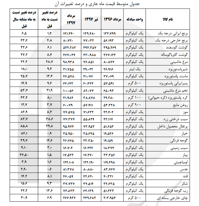 به گزارش ایبِنا، بر اساس نتایج به دست آمده در مرداد ماه ١٣٩٧، بیشترین افزایش قیمت در ماه جاری نسبت به ماه گذشته، مربوط به اقلام «سیب درختی زرد» با ٣٨.٦ درصد افزایش، «پرتقال محصول داخل» با ٢٩,٨ درصد افزایش و «مرغ ماشینی» با ٢٨.٧ درصد افزایش بوده است. در این ماه هیچ گونه کاهش قیمتی نسبت به ماه قبل وجود نداشته است.