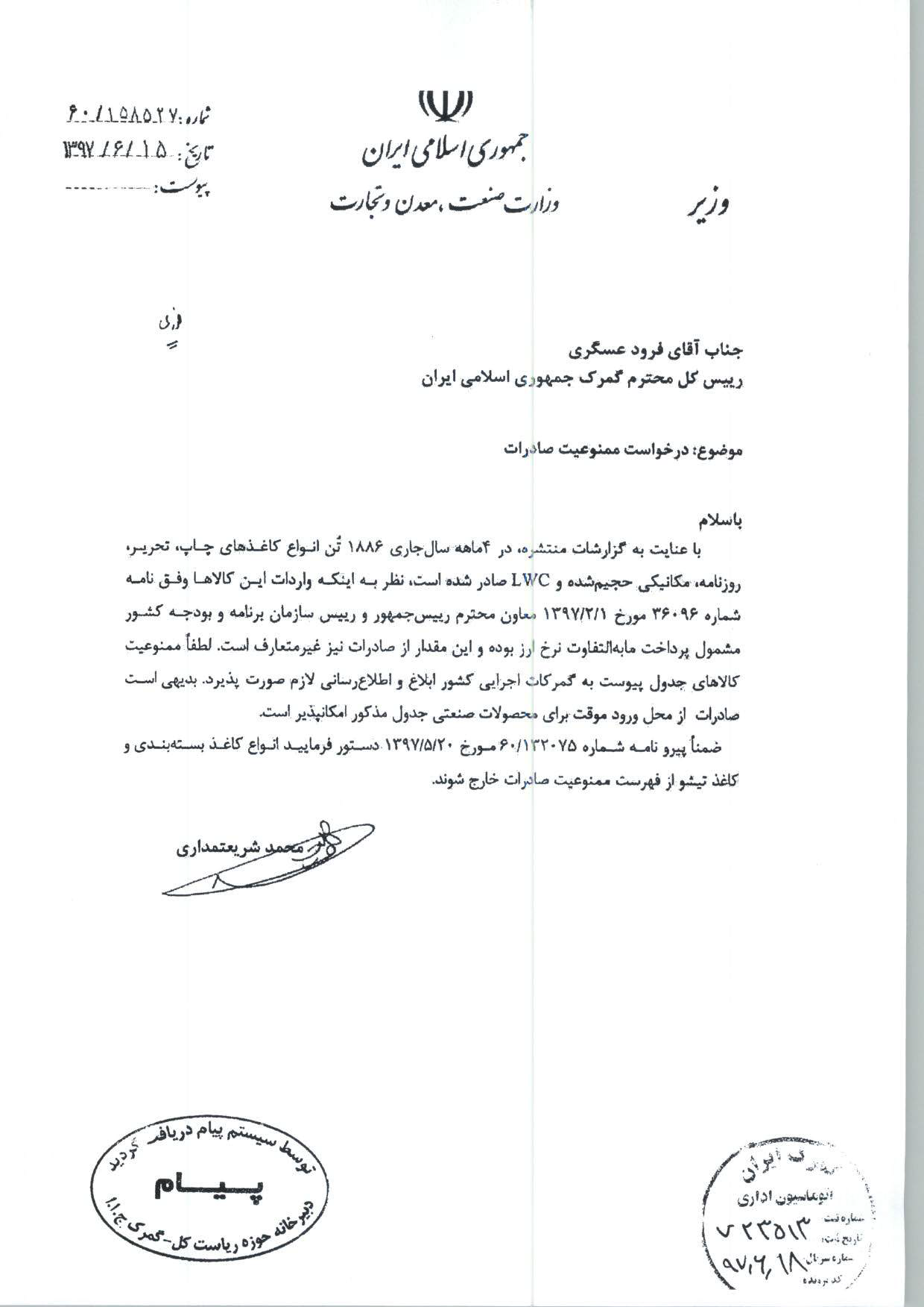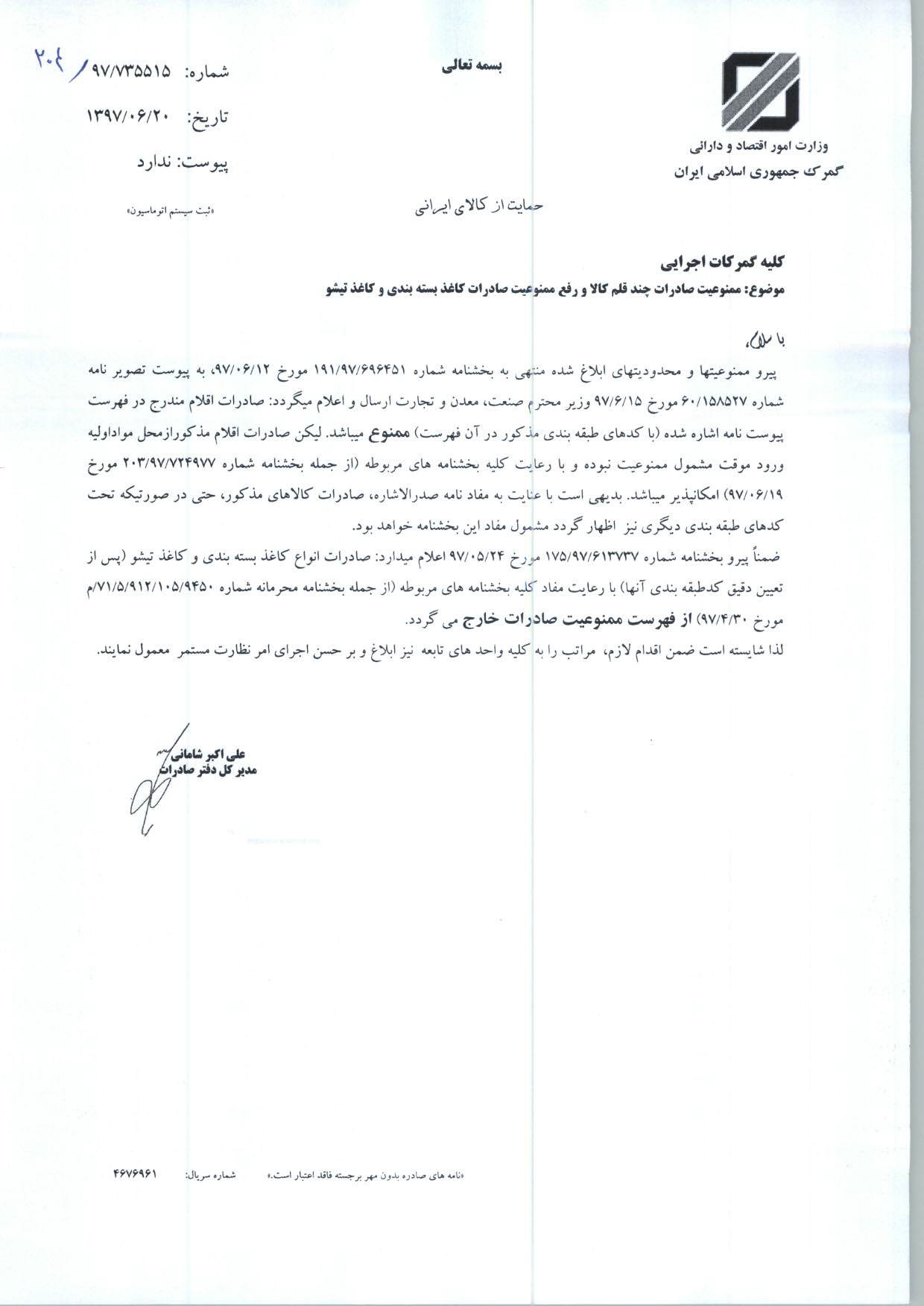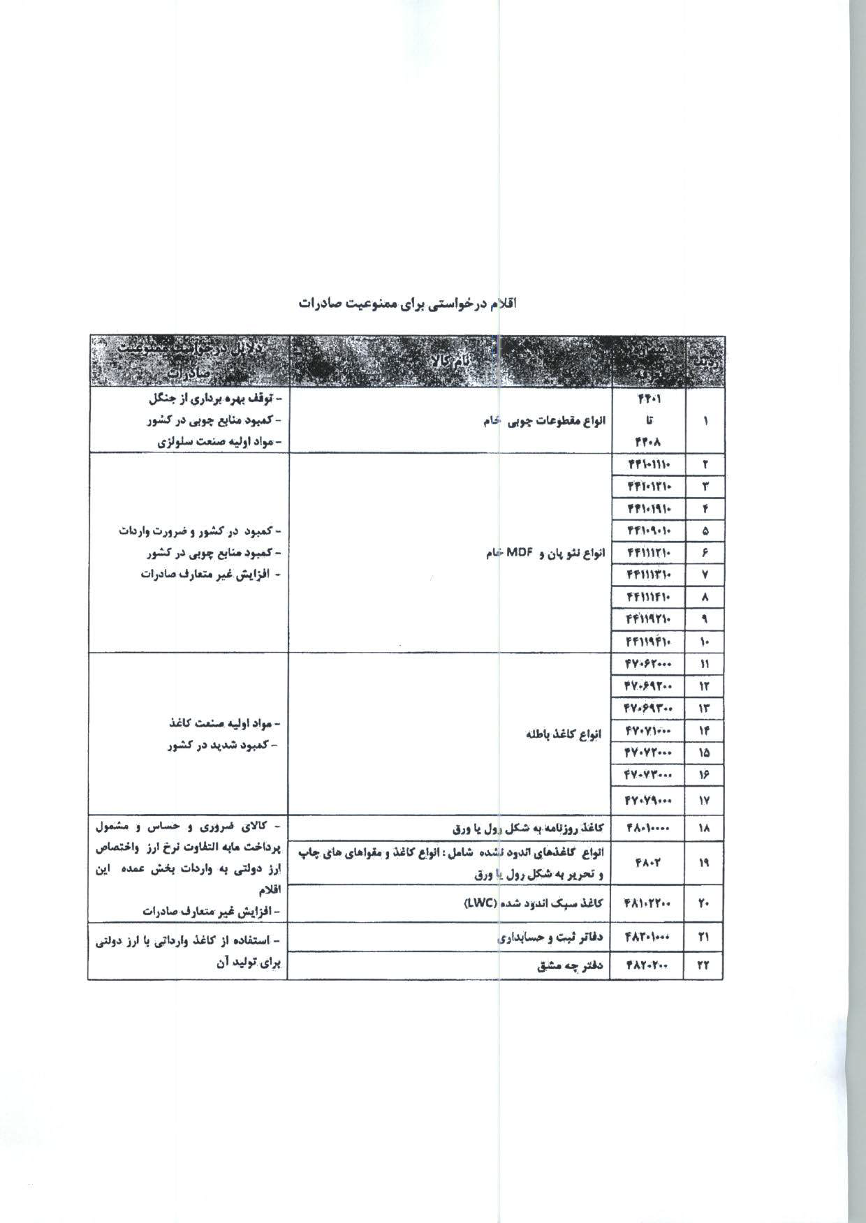 بدیهی است صادرات کالاهای مذکور حتی در صورتی که تحت کدهای دیگری اظهار شود، مشمول مفاد این بخشنامه خواهد بود. ضمنا انواع کاغذ بستهبندی و کاغذ تیشو از فهرست ممنوعیت صادرات خارج میشود.