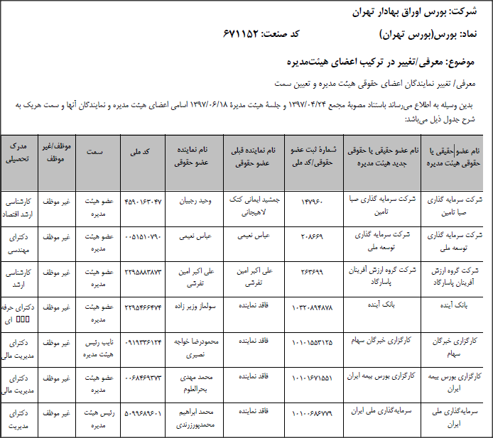 اعضای حقیقی هیات مدیره جدید بورس تهران به استناد مصوبه مجمع عمومی عادی ۲۴ تیر ماه ۹۷ و جلسه هیات‌ مدیره ۱۸ شهریور ماه ۹۷ در سامانه کدال اعلام شد.