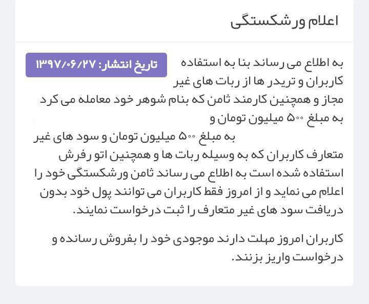 به اطلاع میرساند بنا به استفاده کاربران و تریدرها از رباتهای غیر مجاز و همچنین کارمند ثامن که به نام شوهر خود معامله میکرد به مبلغ ۵۰۰ میلیون تومان و.........به مبلغ ۵۰۰ میلیون تومان و سودهای غیر متعارف کاربران که به وسیله رباتها و اتو رفرش استفاده شده است، به اطلاع میرساند سکه ثامن ورشکستگی خود را اعلام مینماید و از امروز فقط کاربران میتوانند پولهای خود را بدون دریافت سودهای غیر متعارف را ثبت درخواست نمایند. کاربران امروز مهلت دارند موجودی خود را به فروش رسانده و درخواست واریز نمایند.