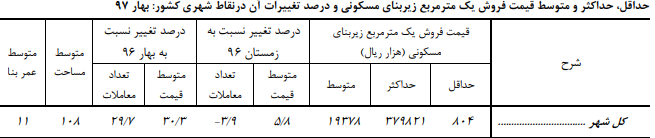 متوسط قیمت فروش هر مترمربع زیربنای مسکونی معامله شده از طریق بنگاههای معاملات ملکی در شهر تهران ۱۹ میلیون و ۳۷۸ هزار ریال با میانگین مساحت ۱۰۸ مترمربع و متوسط عمر بنای ۱۱ سال بوده است که نسبت به فصل قبل ۵.۸ درصد و نسبت به فصل مشابه سال قبل ۳۰.۳ درصد، افزایش داشته است.