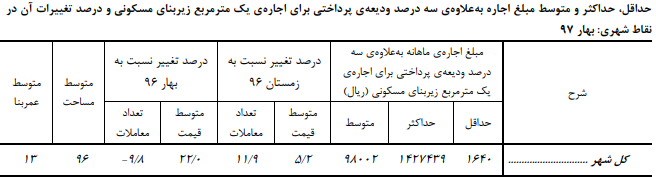 متوسط مبلغ اجاره ماهانه به علاوه سه درصد ودیعه پرداختی برای اجاره یک مترمربع زیربنای مسکونی معامله شده از طریق بنگاههای معاملات ملکی در شهر تهران ۹۸ هزار و ۲ ریال با میانگین مساحت ۹۶ مترمربع و متوسط عمر بنای ۱۳ سال بوده است که نسبت به فصل قبل ۲.۵ درصد و نسبت به فصل مشابه سال قبل ۲۲ درصد، افزایش داشته است.