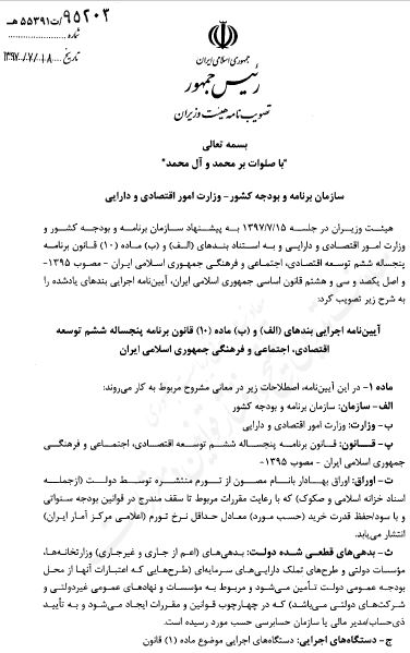 تصویب نامه مصوب جلسه ۱۵ مهر ماه ۹۷ هیأت وزیران در خصوص«آیین نامه اجرایی بند های (الف) و (ب) ماده (۱۰) قانون برنامه پنجساله ششم توسعه اقتصادی، اجتماعی و فرهنگی جمهوری اسلامی ایران»، طی نامه ۱۸ مهر ماه ۹۷ توسط معاون اول رییس جمهور ابلاغ شد.