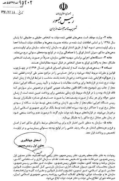 بر اساس این تصویب نامه در بخش «الف» آن آمده است که معادل کل بدهیهای خود به اشخاص حقیقی و حقوقی که تا پایان سال ۱۳۹۵ قطعی شده یا میشود را به ترتیب اولویتهایی که به پیشنهاد سازمان مشخص میشود، تا پایان اجرای قانون برنامه از طریق انتشار اوراق بهادار با کسب رضایت طلبکاران تسویه نماید.