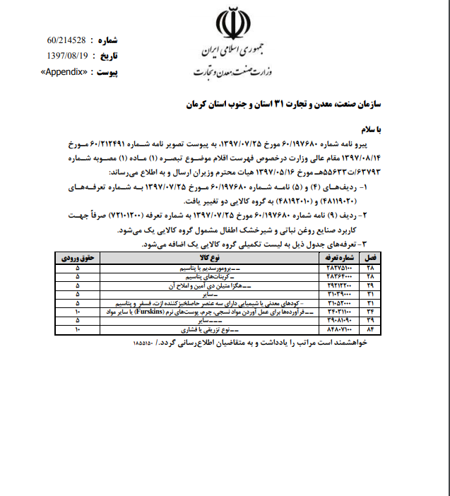 ۱- ردیف‌های ۴ و ۵ نامه شماره ۱۹۷۶۸۰/۶۰ مورخ ۱۳۹۷/۷/۲۵ به شماره تعرفه‌های (۴۸۱۱۹۰۲۰) و (۴۸۱۹۲۰۱۰) به گروه کالایی دو تغییر یافت.