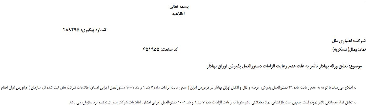 اطلاعیه تعلیق ورقه بهادار اعتباری ملل