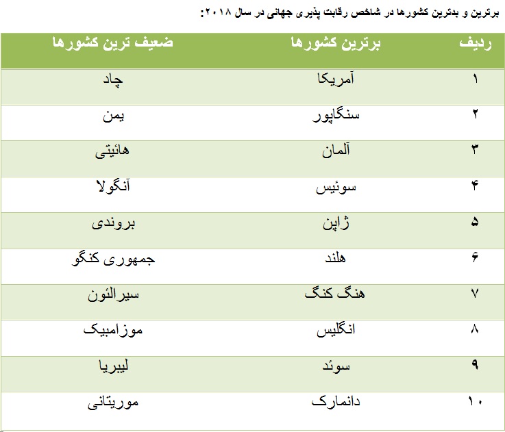 براساس گزارش امسال مجمع جهانی اقتصاد، ۱۰ کشور برتر آمریکا، سنگاپور، آلمان، سوئیس، ژاپن، هلند، هنگ کنگ، انگلیس، سوئد و دانمارک بوده اند. همچنین ۱۰ کشور ضعیف در بین ۱۴۰ کشور بررسی شده نیز کشورهای چاد، یمن، هائیتی، آنگولا، بروندی، جمهوری کنگو، سیرالئون، موزامبیک، لیبریا و موریتانی هستند.