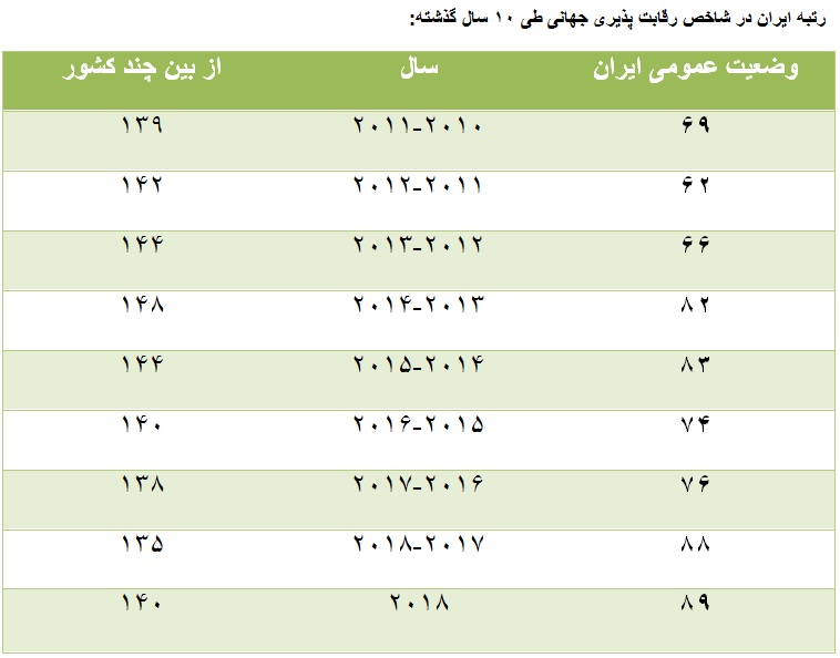 بررسی های ده ساله از رتبه ایران در شاخص رقابت پذیری جهانی طی ۱۰ سال گذشته نشان می دهد که رتبه ایران در این شاخص هیچ گاه پایین تر از ۶۲ (۲۰۱۱ و ۲۰۱۲ و از بین ۱۴۲ کشور) نبوده است. براین اساس رتبه ایران در سال ۲۰۱۷-۲۰۱۸ رتبه ۸۸ از بین ۱۳۵ کشور و برای سال ۲۰۱۶- ۲۰۱۷ نیز رتبه ۷۶ از بین ۱۳۸ کشور بوده است.