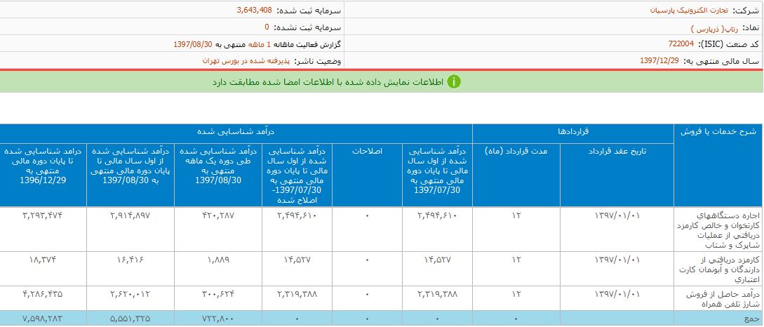 همچنین شرکت تجارت الکترونیک پارسیان نیز با انتشار یک اطلاعیه شفاف سازی در سامانه کدال اعلام کرد که در دوره یک ماهه منتهی به ۳۰ آبان ماه ۹۷ مبلغ ۷۲۲.۸۰۰ میلیون ریال درآمد داشته است