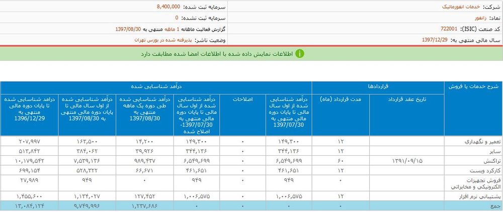 به گزارش ایبِنا، شرکت خدمات انفورماتیک دردوره یک ماهه منتهی به ۳۰ آبان ماه ۹۷ مبلغ ۱.۲۳۸ میلیارد ریال درآمد داشته است.