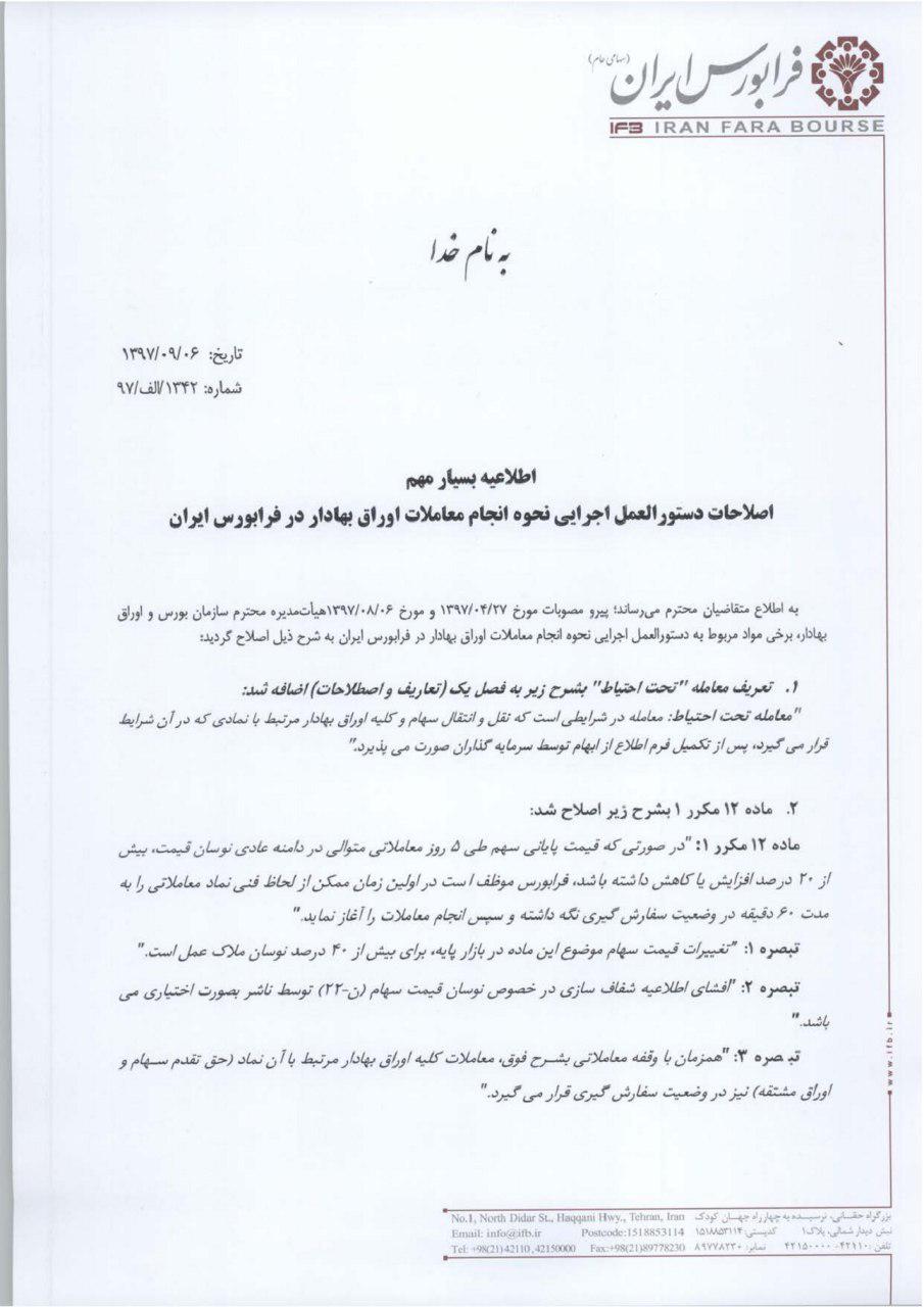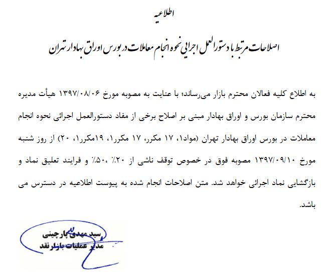 گفتنی است با توجه به مصوبه ۶ آبان ماه ۹۷ هیأت مدیره سازمان بورس و اوراق بهادار مبنی بر اصلاح برخی از مفاد دستورالعمل اجرائی نحوه انجام معاملات در بورس اوراق بهادار تهران «مواد ۱، ۱۷ مکرر، ۱۷ مکرر۱، ۱۹مکرر۱، ۲۰» از روز شنبه ۱۰ آذر ماه ۹۷ مصوبه فوق در خصوص توقف ناشی از ۲۰ درصد، ۵۰ درصد و فرایند تعلیق نماد و بازگشایی نماد اجرایی می شود.