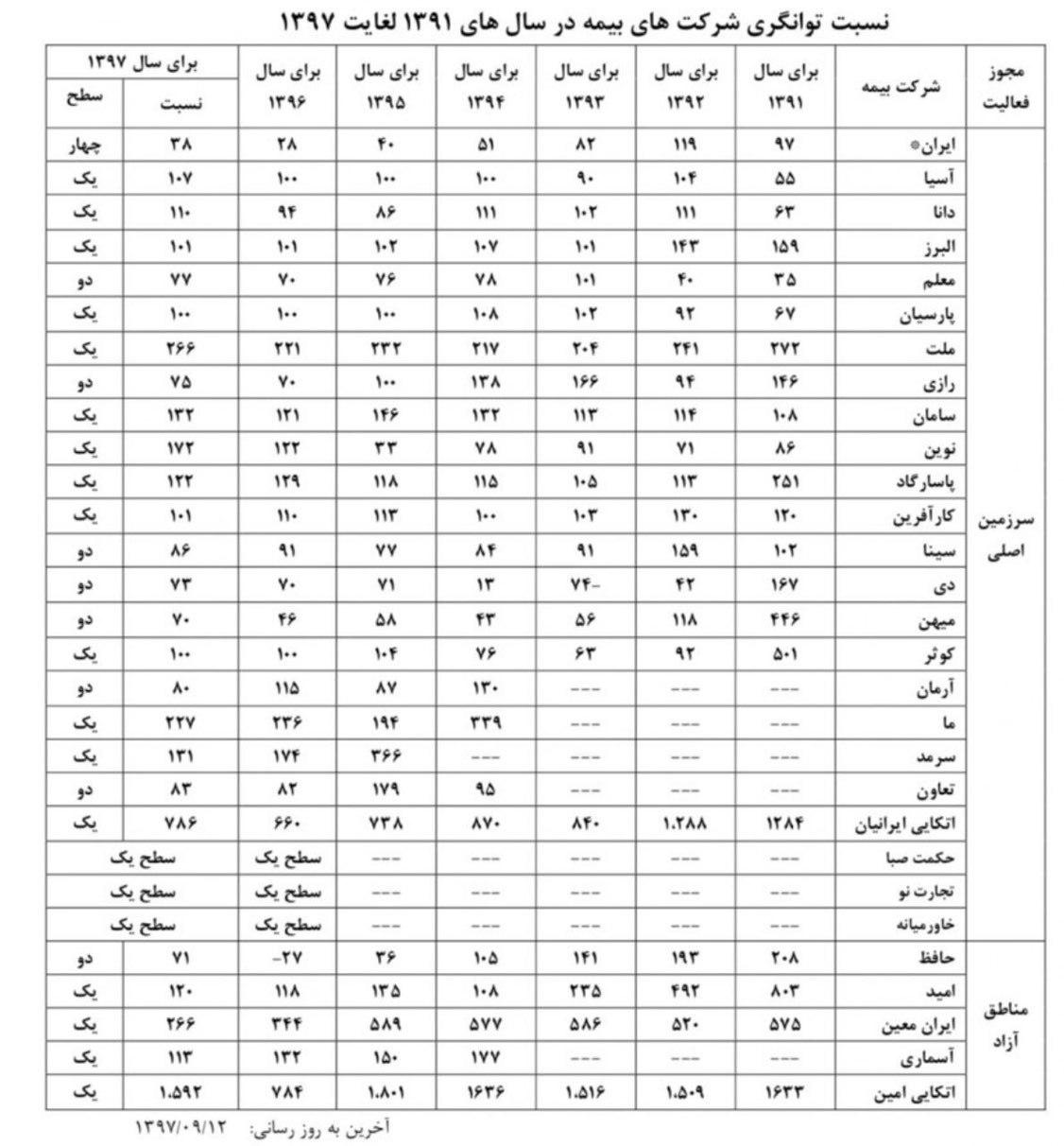 براساس جدول خلاصه وضعیت توانگری مالی شرکت های بیمه از سال ۱۳۹۱ تا ۱۳۹۷، شرکت های بیمه آسیا (۱۰۷)، دانا (۱۱۰)، البرز (۱۰۱)، پارسیان (۱۰۰)، ملت (۲۶۶)، سامان(۱۳۲)، نوین(۱۷۲)، پاسارگاد(۱۲۲)، کارآفرین(۱۰۱)، کوثر(۱۰۰)، ما (۲۲۷)، سرمد(۱۳۱)، امید(۱۲۰)، ایران معین(۲۶۶) و آسماری (۱۱۳) در سطح یک اعلام شده اند.