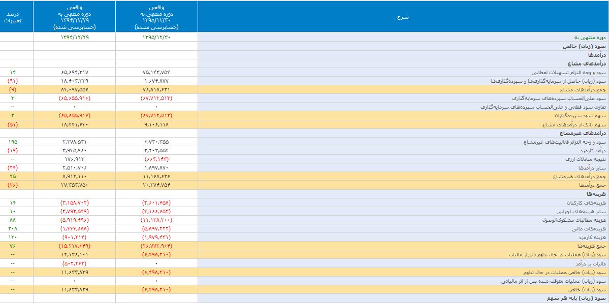 افزون بر این، بانک پاسارگاد در دوره ۱۲ ماهه منتهی به۳۰ اسفند ۹۵ «حسابرسی نشده» به ازای هر سهم ۱۲۹ ریال زیان شناسایی کرده و این در حالی است که این شرکت در مدت مشابه سال قبل به ازای هر سهم ۲۳۱ ریال سود محقق کرده بود.