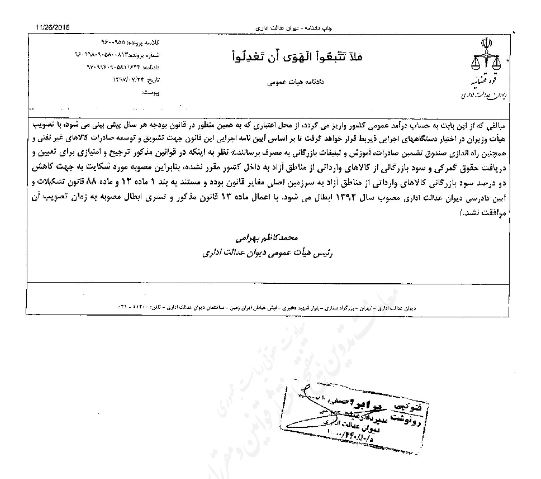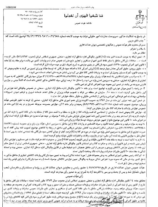 دیوان محاسبات کشور در مرداد ماه سال گذشته درخواست ابطال تصویبنامه هیات وزیران با موضوع تعیین عوارض دریافتی توسط سازمان های مناطق آزاد از کالاهایی که به صورت تجاری از مناطق آزاد تجاری - صنعتی به سرزمین اصل را به دیوان عدالت اداری ارسال کرد و تاکید کرد با توجه به اهمیت موضوع و جهت جلوگیری از تضییع حقوق بیت المال و وصول صحیح حقوق ورودی و مالیات و متعلقه این مورد باید بررسی شود؛ در دادنامه هیات عمومی دیوان عدالت اداری و در بخش ماده ۲۰ و در خصوص شکایت مطرح شده از سوی دیوان محاسبات کشور اعلام شده که نظر به این که در قوانین مذکور ترجیح و امتیازی تعیین و دریافت حقوق گمرکی و سود بازرگانی از کالاهای وارداتی از مناطق آزاد به داخل کشور مقرر نشده، بنابراین مصوبه مورد شکایت به جهت کاهش دو درصد سود بازرگانی کالاهای وارداتی از مناطق آزاد به سرزمین اصلی مغایر قانون بوده و مستند به بند یک ماده ۱۲ و ماده ۸۸ قانون تشکیلات و آیین دادرسی دیوان عدالت اداری مصوب سال ۱۳۹۳ ابطال میشود. همچنین با اعمال ماده ۱۳ قانون مذکور و تسری ابطال مصوبه به زمان تصویب آن موافقت نشد.
