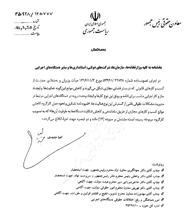 در این بخشنامه آمده است: در اجرای تصویب نامه شماره ۲۲۸۴۸/۵۴۹۹۱ مورخ سوم بهمن ماه ۱۳۹۶ هیات وزیران و به منظور حمایت از کسب و کارهای قانونی که در بستر فضای مجازی شکل می گیرند و کاهش موانع این گونه فعالیت ها و ایجاد ساز و کار اجرایی مناسب برای ادامه و رونق این نوع کارها و ایجاد وحدت رویه در دستگاه های اجرایی مرتبط در مدیریت مشکلات حقوقی ناشی از گسترش این نوع فعالیت ها، «شیوه نامه تشکیل و نحوه عمل کارگروه کاهش موانع کسب و کارهای مجازی از طریق ساماندهی و کاهش شکایت دستگاه ها به طرفیت آنها» که به تصویب کارگروه مربوطه رسیده است، مشتمل بر ۱۳ ماده و ۲ تبصره جهت اجرا ابلاغ می شود.