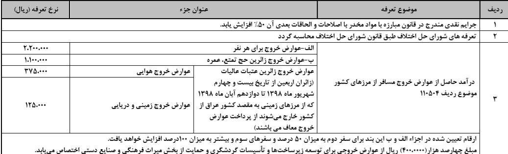 از سوی دیگر، عوارض خروج زائران حج تمتع و عمره معادل ۱۱۰ هزار تومان و عوارض خروج زائران عتبات عالیات برای خروج از مرزهای هوایی ۳۷ هزار و ۵۰۰ تومان و برای مرزهای زمینی و دریایی ۱۲ هزار و ۵۰۰ تومان اعلام شده است.