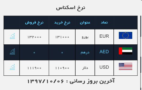 همچنین نرخ خرید دلار در صرافی ملی ۱۱ هزار ۹۰ تومان، نرخ خرید یورو ۱۳ هزار و ۱۰۰ تومان و نرخ فروش یورو ۱۳ هزار و ۲۰۰ تومان اعلام شده است.