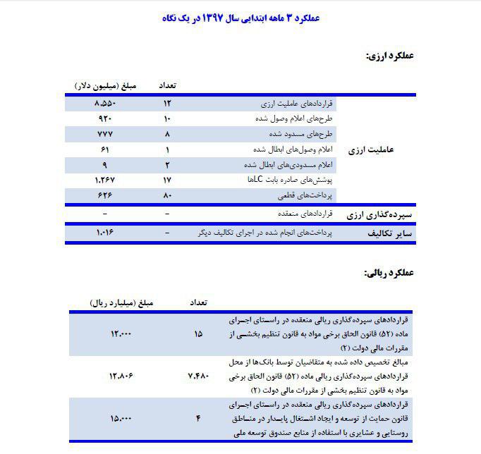 همچنین این صندوق در مدت زمان مورد اشاره در ۸۰ مورد مختلف ۶۲۶ مورد پرداخت قطعی داشته است. آمار منتشر شده از سوی صندوق توسعه ملی نشان می دهد که این صندوق در سه ماهه نخست سال جاری هیچگونه سپرده گذاری ارزی بابت قراردادهای منعقد شده در بانک ها نداشته است.