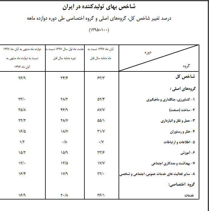 در آبان ماه ۱۳۹۷، شاخص بهای گروه ساخت (صنعت) به میزان ۳.۵ درصد نسبت به ماه قبل افزایش یافت که بیشتر ناشی از بالا رفتن شاخص بهای اقلام و گروههایی مانند ماهی منجمد معادل ۲۰.۱ درصد، چیپس ۷۲.۶ درصد، خشکبار ۱۰.۵ درصد، سرکه ۱۵.۳ درصد، سبوس گندم ۸.۳ درصد، فرآوردههای نانوایی ۷.۱ درصد، ملاس و باگاس ۵۴.۱ درصد، حلوا شکری ۱۴.۳ درصد، سس قرمز ۲۶.۱ درصد، چای و دمنوش ۱۰.۷ درصد، خمیرمایه ۱۱.۳ درصد، نخهای مصنوعی ۸.۴ درصد، پارچه تولید شده از نخ طبیعی ۱۳ درصد، قالی، قالیچه و موکت ۶.۸ درصد، پیراهن مردانه ۷.۵ درصد، کاپشن و اورکت ۲۱.۲ درصد، تولید فرآوردههای چوب، چوب پنبه، حصیر و مواد حصیربافی ۱۸ درصد، کاغذ و مقوا ۱۴.۶ درصد، کک ۱۰.۶ درصد، سوخت سبک هواپیما (جیپیفور) ۱۴۱.۳ درصد، پنتان ۹۱.۷ درصد، اتان ۹۷.۳ درصد، روغنها، روانکارها و فرآوردههای پالایش شده سنگین نفتی ۹ درصد، قیر ۳۳.۳ درصد، مواد شیمیایی اساسی مصرف داخلی ۳۹.۹ درصد، کود و ترکیبات ازت مصرف داخلی ۸.۳ درصد، پلاستیک و لاستیک مصنوعی پایهای ۸.۸ درصد، پلی اتیلن سبک ۱۴.۵ درصد، استایرن ۴۲.۹ درصد، سموم دفع آفات و حشرهکشها ۱۴.۵ درصد، لعاب و فریت ۴۴.۳ درصد، صابون و مایع دستشویی ۸.۵ درصد، ضدیخ ۲۸.۸ درصد، نخ تایر ۷.۱ درصد، تولید داروهای شیمیایی و گیاهی ۲.۴ درصد، محصولات پلاستیکی ۴ درصد، شیشه و فرآوردههای شیشهای ۳۰.۹ درصد، ظروف چینی ۸.۹ درصد، بتون ۸.۴ درصد، لوله آهنی و فولادی ۷.۳ درصد، ورقهای آهن ۱۰ درصد، آهن اسفنجی ۱۹.۶ درصد، پروفیل آهنی ۱۵.۷ درصد، قطعات ریختهگری ۱۸.۳ درصد، منبع و مخزن فلزی ۸.۲ درصد، الکترود ۲۲.۱ درصد، سی دی و دی وی دی ۷.۷ درصد، تلویزیون ۲۰ درصد، رادیو ۱۹.۴ درصد، ترانسفورماتور توزیع ۱۲.۷ درصد، کلید برق فشار قوی ۱۲.۸ درصد، وسایل خانگی برقی و گازی از ۲.۴ درصد تا ۲۸.۵ درصد، بلبرینگ ۹ درصد، لیفتراک ۷.۷ درصد، فن کوئل ۳۲.۳ درصد، هواکش صنعتی ۷.۸ درصد، گاو آهن ۲۴.۴ درصد، ماشین فرز ۱۵.۷ درصد، اتوبوس ۲۷.۴ درصد، قطعات و لوازم الحاقی وسایل نقلیه موتوری ۰.۴ درصد تا ۴۶ درصد و موتورسیکلت ۵۵.۵ درصد بود.