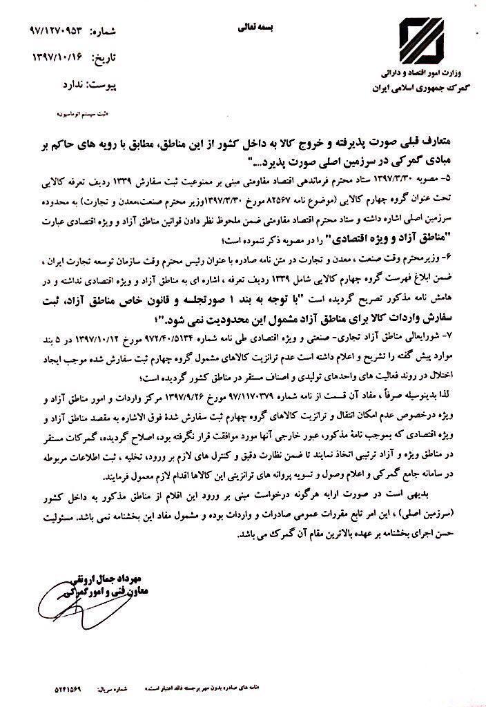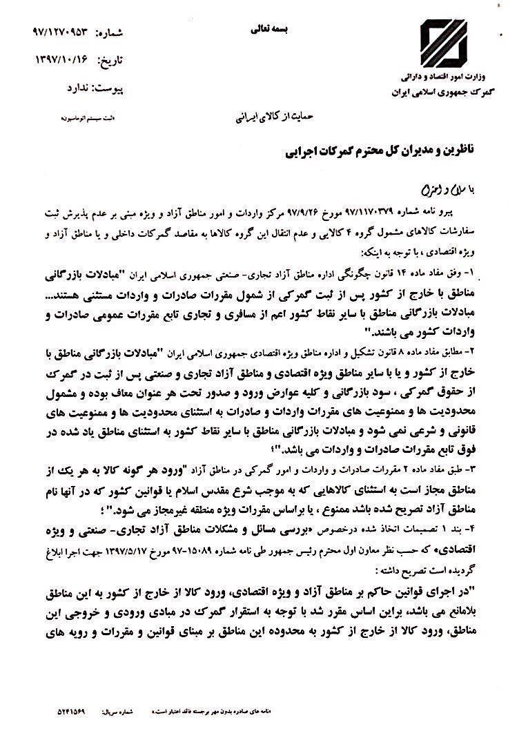 این بخشنامه در راستای اجرای سیاست های جدید دولت و دستور معاون اول رییس جمهور، وزیر امور اقتصادی و دارایی و همچنین رییس کل گمرک ایران مبنی بر انجام اقدامات اورژانسی برای کاهش رسوب کالا در بنادر صورت می گیرد.