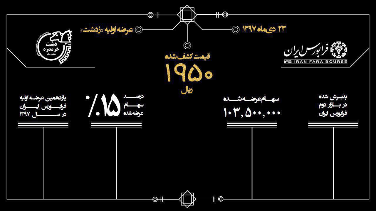 در عرضه اولیه ۱۰۳ میلیون و ۵۰۰ هزار سهم از مجموع سهام شرکت کشت و صنعت و دامپروری و مرغداری دشت خرمدره در نماد «زدشت»، ۳۰۹ هزار و ۱۷۵ خریدار حضور یافت که مشارکت این تعداد کد معاملاتی که با ثبت تقاضای بیش از ۳۱۸ میلیون و ۷۶۴ هزار سهمی از سوی آنان همراه بود، موجب شد به هر کد حداکثر ۳۳۹ سهم تخصیص یابد. این در حالی است که پیش از عرضه اولیه حداکثر تعداد سهام قابل خریداری توسط هر شخص حقیقی و حقوقی ۱۲۰۰ سهم تعیین شده بود.