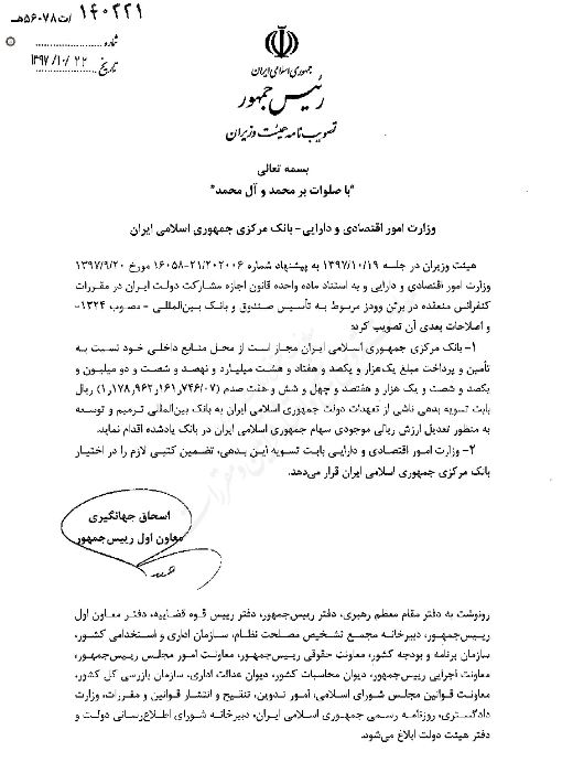 به گزارش خبرنگار ایبِنا، تصویبنامه مصوب جلسه مورخ ۹۷/۱۰/۱۹ هیات وزیران در خصوص"مجاز دانستن بانک مرکزی برای تسویه بدهی ناشی از تعهدات دولت جمهوری اسلامی ایران به بانک بین المللی ترمیم و توسعه به منظور تعدیل ارزش ریالی موجودی سهام جمهوری اسلامی ایران در بانک یاد شده"، طی نامه شماره ۱۴۰۲۲۱ در تاریخ ۹۷/۱۰/۲۲ توسط معاون اول رییس جمهور ابلاغ گردید.