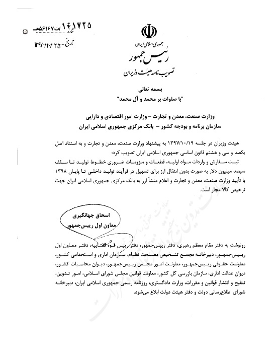 در این تصویبنامه که در تاریخ ۲۵ دی ماه ۱۳۹۷ برای اجرا ابلاغ شده، آمده است: هیات وزیران در جلسه ۱۹ دی ماه به پیشنهاد وزارت صنعت، معدن و تجارت به استناد اصل یکصد و سی و هشتم قانون جمهوری اسلامی ثبت سفارش و واردات مواد اولیه، قطعات و ملزومات ضروری خطوط تولید تا سقف ۳۰۰ میلیون دلار به صورت بدون انتقال ارز برای تسهیل در فرایند تولید داخلی تا پایان سال ۱۳۹۸ را تصویب کرده است.