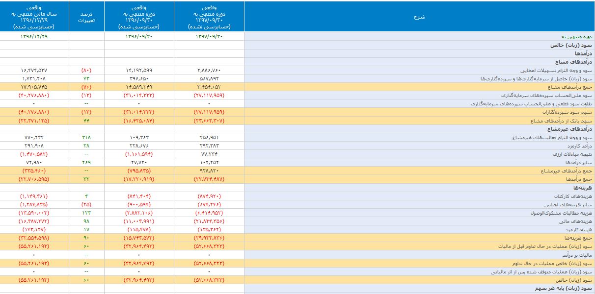 این گزارش شفاف سازی نشان می دهد این شرکت بر اساس عملکرد ۹ ماهه برای سال مالی منتهی به ۲۹ اسفند ۹۷ مبلغ ۵۲.۶۶۸ میلیارد ریال زیان خالص محقق کرده است.