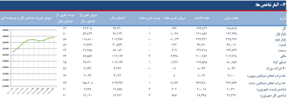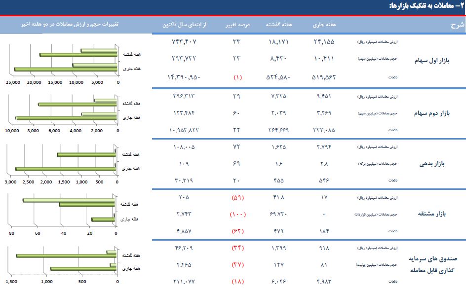 بر اساس این گزارش، شاخص بازار اول با ۱۰۹۷ واحد افزایش به رقم ۱۲۲.۹۴۸ واحد رسید و شاخص بازار دوم با ۱۰۳۴ واحد افزایش عدد ۳۲۶.۳۳۱ واحد را تجربه کرد و به این ترتیب شاخص بازار اول با یک درصد و شاخص بازار دوم  با صفر درصد نسبت به هفته قبل بدون تغییر ماند.