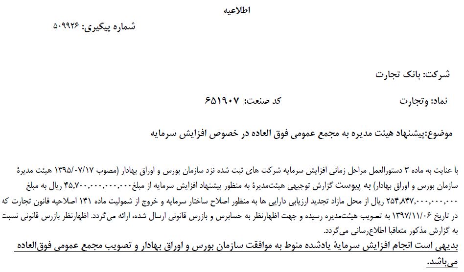 گفتنی است، انجام افزایش سرمایه یاد شده منوط به موافقت سازمان بورس و اوراق بهادار و تصویب مجمع عمومی فوق العاده است.