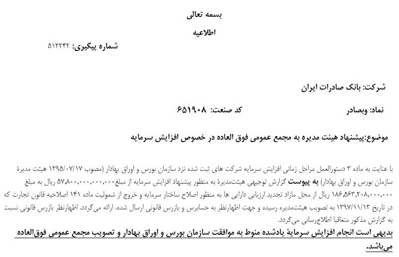 بر مبنای اطلاعات منتشر شده «وبصادر» در نظر دارد سرمایه صاحبان سهام خود را از مبلغ ۵۷ هزار و ۸۰۰ میلیارد ریال به مبلغ ۱۸۶هزار و ۵۶۳ میلیارد و ۲۰۸ میلیون ریال معادل ۲۲۳ درصد افزایش دهد و این بانک اعلام کرده است که این افزایش سرمایه از محل مازاد تجدید ارزیابی دارایی ها صورت می گیرد.
