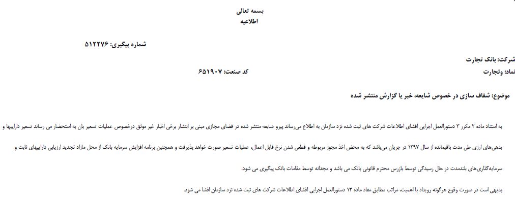 در ادامه این اطلاعیه شفاف سازی بانک تجارت آمده است که برنامه افزایش سرمایه بانک از محل مازاد تجدید ارزیابی دارایی های ثابت و سرمایه‌گذاری‌های بلندمدت این بانک در حال رسیدگی توسط بازرس قانونی بانک است.
