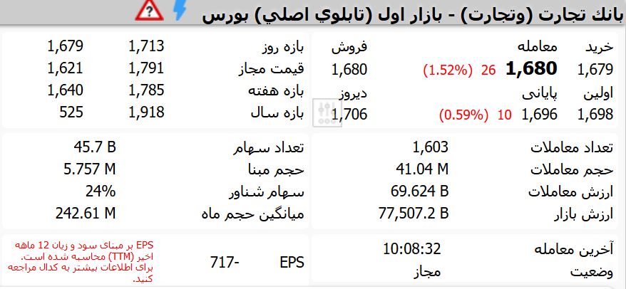 این گزارش می افزاید: بر اساس اطلاعات تارنمای TSETMC در حال حاضر نماد معاملاتی شرکت بانک تجارت که با نماد «وتجارت» در بازار اول «تابلوی اصلی» بورس فعال است در وضعیت «مجاز» قرار دارد و هیچ گونه محدودیتی برای داد و ستد به روی سهام این شرکت وجود ندارد.