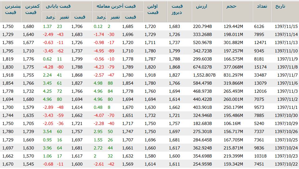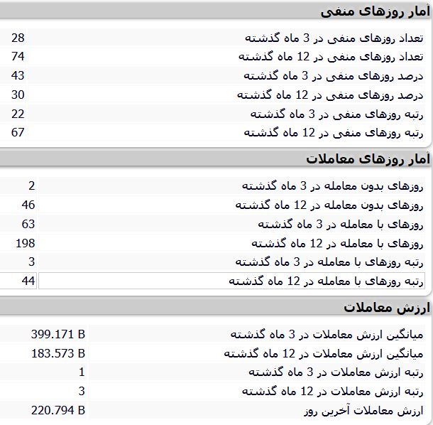 همچنین آخرین وضعیت این شرکت در بازار سهام نیز نشان می دهد «P/E» سهام این شرکت منفی (۲.۳۷) مرتبه و «EPS» آن به میزان منفی (۷۱۷) ریال در صورت های مالی درج شده است.