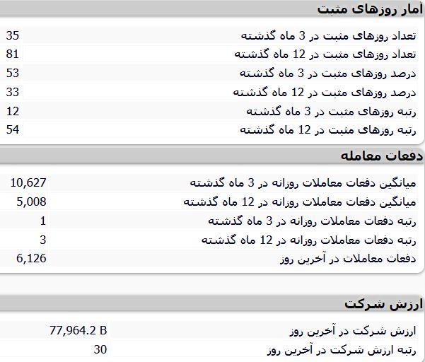 روزهای معاملاتی مثبت، دفعات معامله، ارزش و رتبه شرکت
