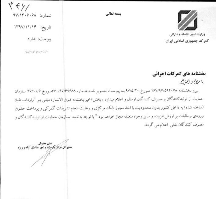 رئیس اتحادیه تولیدکنندگان و صادرکنندگان طلا، جواهر، نقره و سنگ‌های قیمتی ایران، ادامه داد: فردای ابلاغ این بخشنامه در اتاق بازرگانی با محمد شریعتمداری و مجتبی خسروتاج وزیر وقت صمت و رییس وقت سازمان توسعه تجارت جلسه ای داشتیم که هر دو از این بخشنامه تعجب کردند و ما متوجه شدیم که این بخشنامه ناشی از تفسیر نادرست گمرک است.