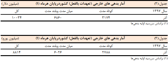 این تعهدات بالفعل ایران بر مبنای یورو نیز رقمی بالغ بر ۸ هزار و ۸۱۴ میلیون یورو محاسبه شده که ۶ هزار و ۲۶ میلیون یورو از این میزان حجم بدهیهای میانمدت و بلندمدت و ۲ هزار و ۷۸۸ میلیون یورو حجم بدهیهای کوتاهمدت است.