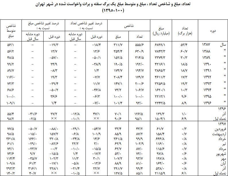 در ۹ ماه اول سال ١٣٩٧ معادل ۶ هزار و ۱۰۰ برگ سفته و برات به مبلغی معادل ۲۱۱۵ میلیارد و ۹۰۰ میلیون ریال در شـهر تهران واخواست شد. در این دوره متوسط شاخصهای تعداد و مبلغ سفته و برات واخواست شده به ترتیب به اعداد ۸۵.۱ و ۱۲۷.۵ رسید که نسبت به دوره مشابه سال قبل از لحاظ تعداد ۱۰.۵ درصد کاهش و از لحاظ مبلغ ۴۰.۷ درصد افزایش نشان میدهد. شاخص متوسط مبلغ یک برگ سفته و برات واخواست شده در ۹ ماه اول سال ١٣٩٧ به عدد ۱۴۰.۲ رسید. عدد شاخص مذکور در ۹ ماه اول سال ١٣٩٦ معادل ۹۸.۲ بوده است.